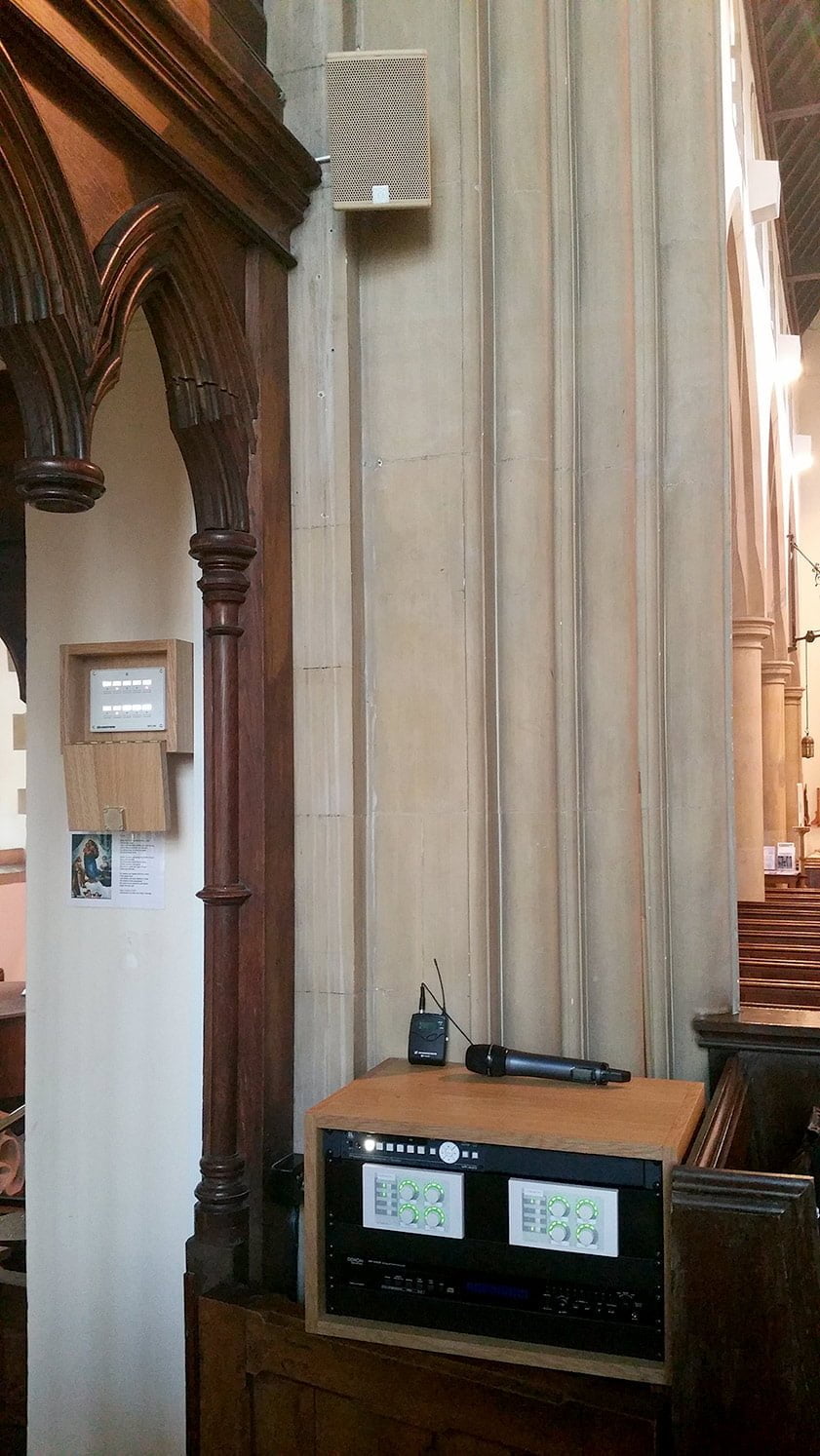 Four rechargeable Sennheiser G3 wireless UHF radio microphones were installed (with remote antennae) to give flexibility for various uses. A separate mobile band mixer was supplied, which can be connected from 2 different locations when a worship band are present, without compromising the very simple, user-friendly nature of the basic speech system.