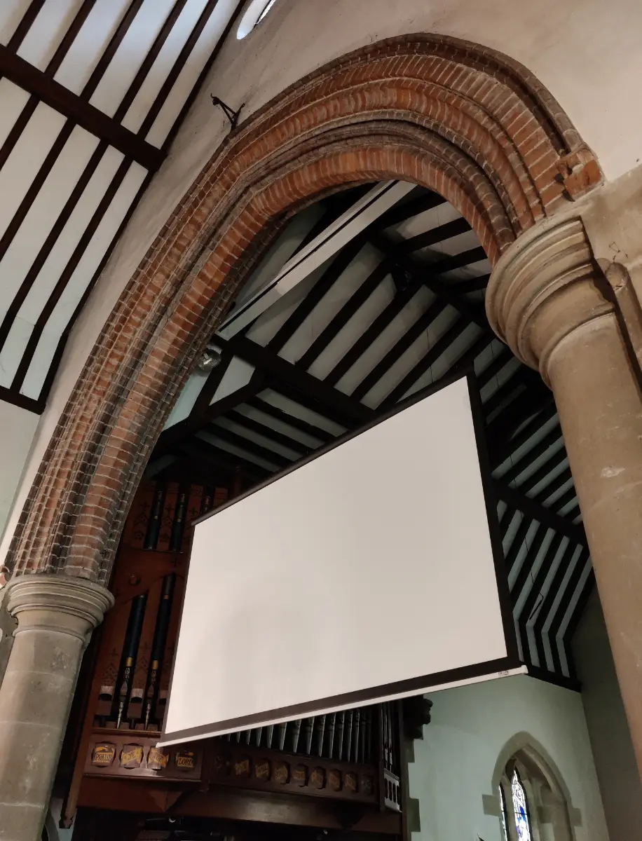 The existing projection system was upgraded to a 4K UHD laser installation projector, mounted discreetly at the rear of the church. A 3m-wide electric projection screen is recessed high within the chancel arch, minimising visual impact when not in use while providing bright, clear images for services and events.