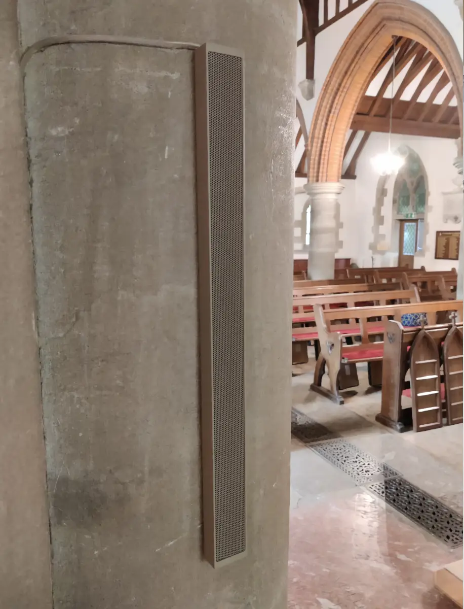 The preferred ultra-discreet design uses slim column array loudspeakers positioned on either side of the chancel arch, with additional compact arrays serving the chancel. This approach delivers highly intelligible speech with minimal visual impact. A discreet subwoofer extends the system beyond speech-only use, providing warmth and depth for music and multimedia playback.