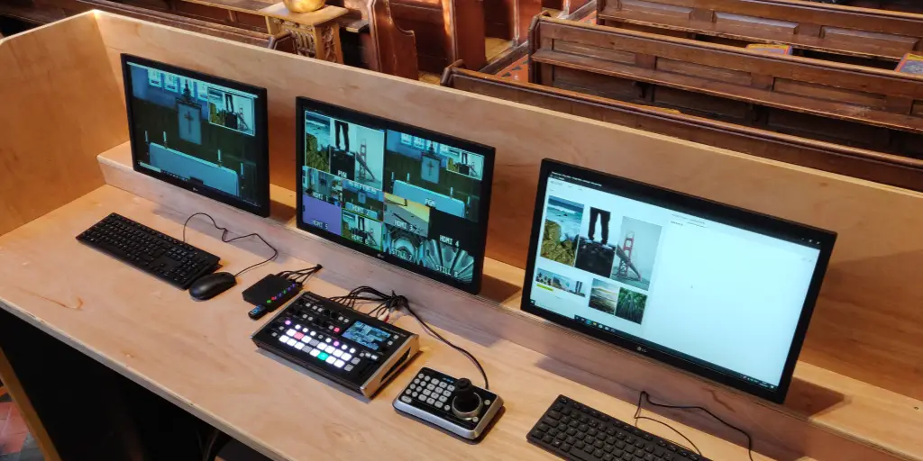 The installation also included a video mixer for managing multiple inputs during services and bespoke cabling and integration work, ensuring reliability and ease of use by both technical and non-technical volunteers.