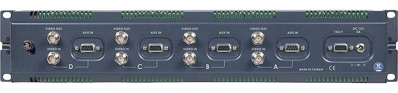 19″ Rack Mountable Bank of 4 x 4″ LCD Monitors. Robust steel and aluminium construction. Each monitor has individual adjustments for Contrast, Brightness and Colour Saturation and 3 colour LED tally light indication. Composite video input with loop through. Ideal companion for SE-800 Mixer. Suitable for OB Van or Studio use. As a leading manufacturer Datavideo work closely with LCD manufacturers to ensure only the highest quality displays are used and offer a guarantee against spotlight defects. The high quality professional TLM monitor series automatically switches between PAL / NTSC and for flexibility can be powered via 12 V DC or AC power. The Datavideo TLM monitor series is designed for video professionals that insist on superior performance. After all, every professional knows that you are only as good as the tools you use. Whether it’s in combination with switchers, 19″ rack monitoring, in field operation, video editing, or the most advanced multimedia video you’re creating, the Datavideo TLM monitor range offers the right tools for your job.